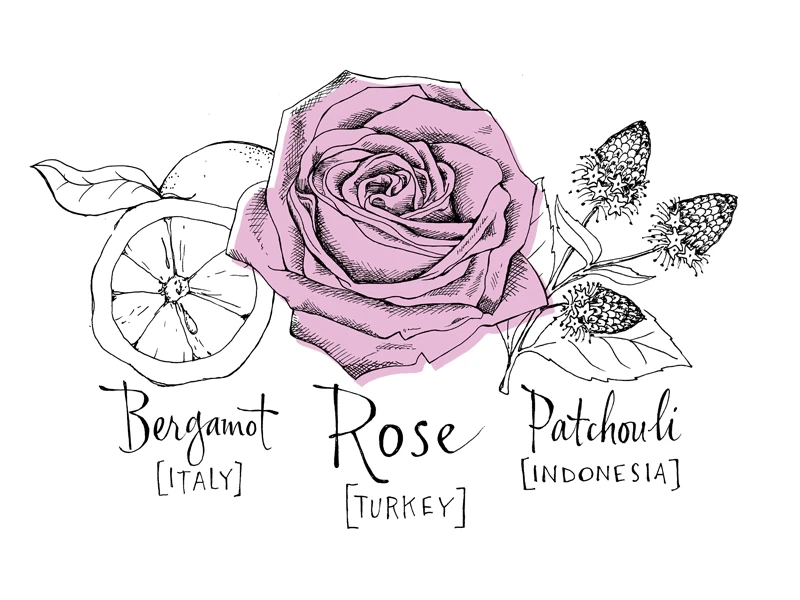 Ce sont tout d’abord les envoûtantes notes florales de la rose de Turquie que l’on distingue, bientôt remplacées par le parfum hespéridé de la bergamote italienne. La base du parfum, qui tient longtemps sur la peau, est faite de patchouli provenant d’Indonésie.