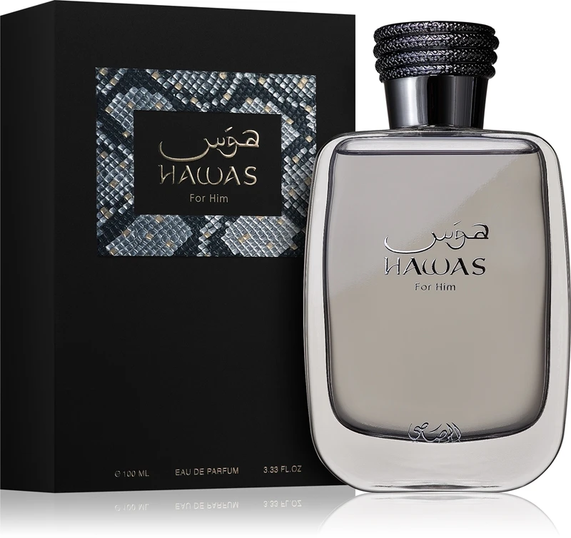 Le flacon gris transparent du parfum Rasasi Hawas For Men est embelli d’un motif de python qui semble envelopper le bouchon métallique. La marque Rasasi qui nous vient de Dubaï a sorti cette eau de parfum pour hommes en 2015.