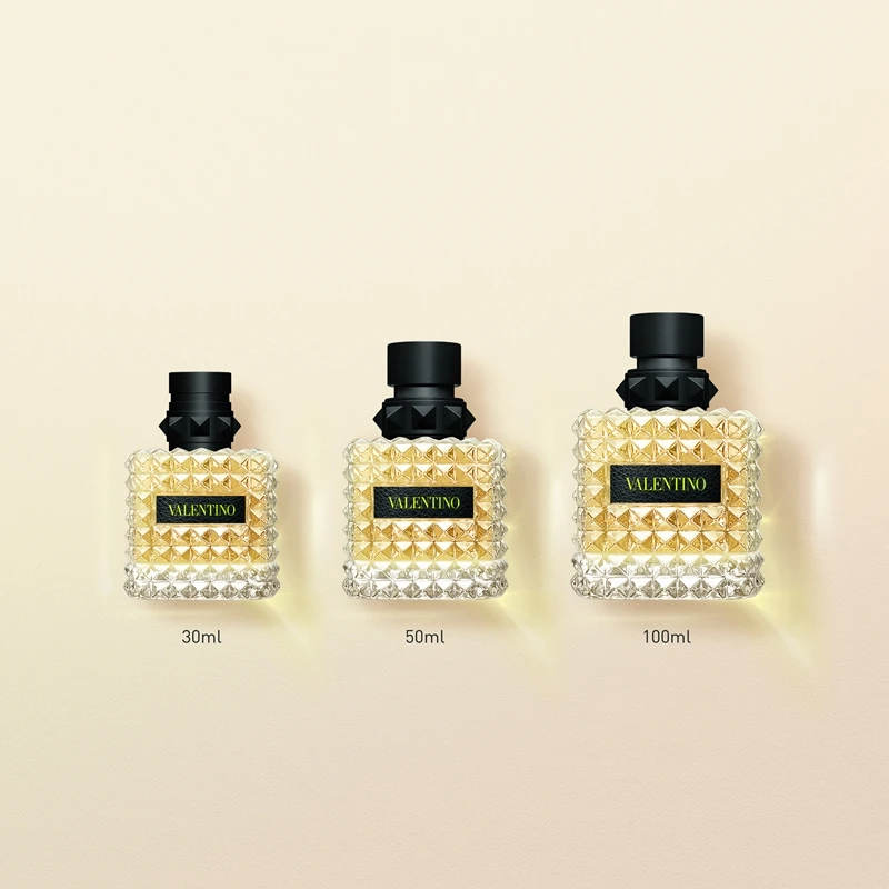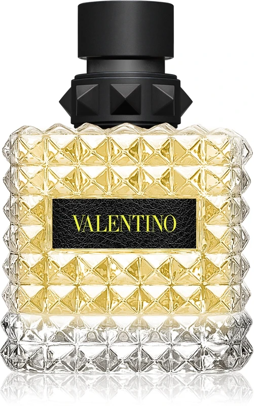 Les parfums Valentino se font remarquer au premier coup d’œil grâce au clou iconique, forme pyramidale que l’on retrouve également sur le flacon de cette eau de parfum. Réalisée en jaune fluo, la signature VALENTINO se détache du fond noir en un contraste saisissant.